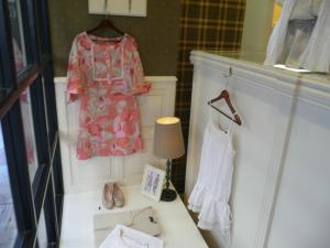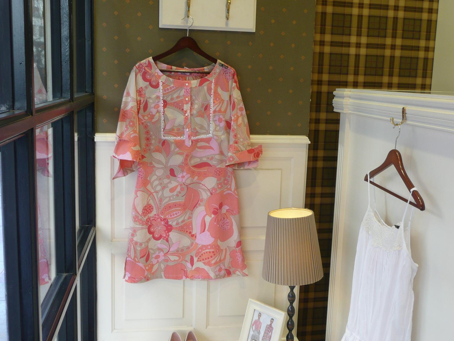 Camisola o vestido corto con estampado en tonos coral. Es totalmente favorecedor para mujeres tipo «primavera», fácil de combinar con blanco es ideal, pero también con beig.