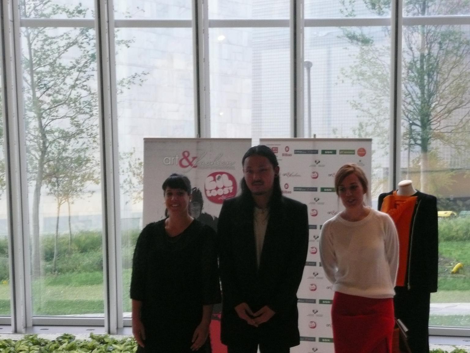 En el centro, el japonés Yuichi Ozaki, ganador en la categoría de prendas de vestir; a su derecha, la israelita Hila Raby-Vardi ganadora en la categoría de complementos; a su izquierda, Alazne Etxebarri, ganadora en la categoría de mejor diseñadora vasca.