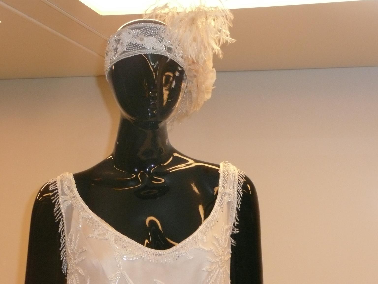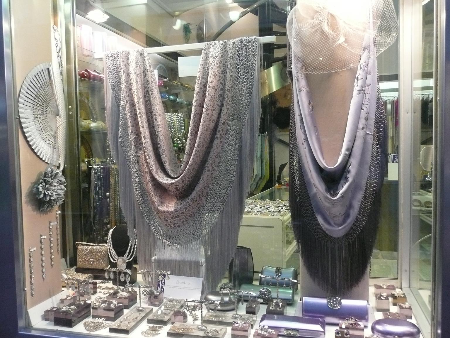 Me encantó el escaparate lateral. Mantones de seda, abanicos, bolsos y joyería en tonos lilas y plata.